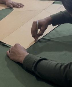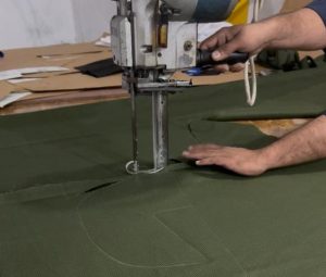 The fabric is laid out and cut precisely following the pattern to form each part of the product, ensuring perfect fit, comfort, and flexibility.